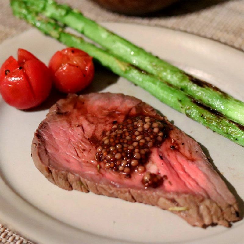 粒状のマスタード・シードを漬け込み、タスマニアの熱帯雨林で収穫された野生のマウンテンペッパーベリーとタスマニア産ハチミツをアクセントとして調味料に使用。