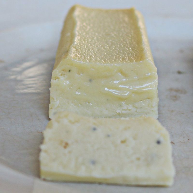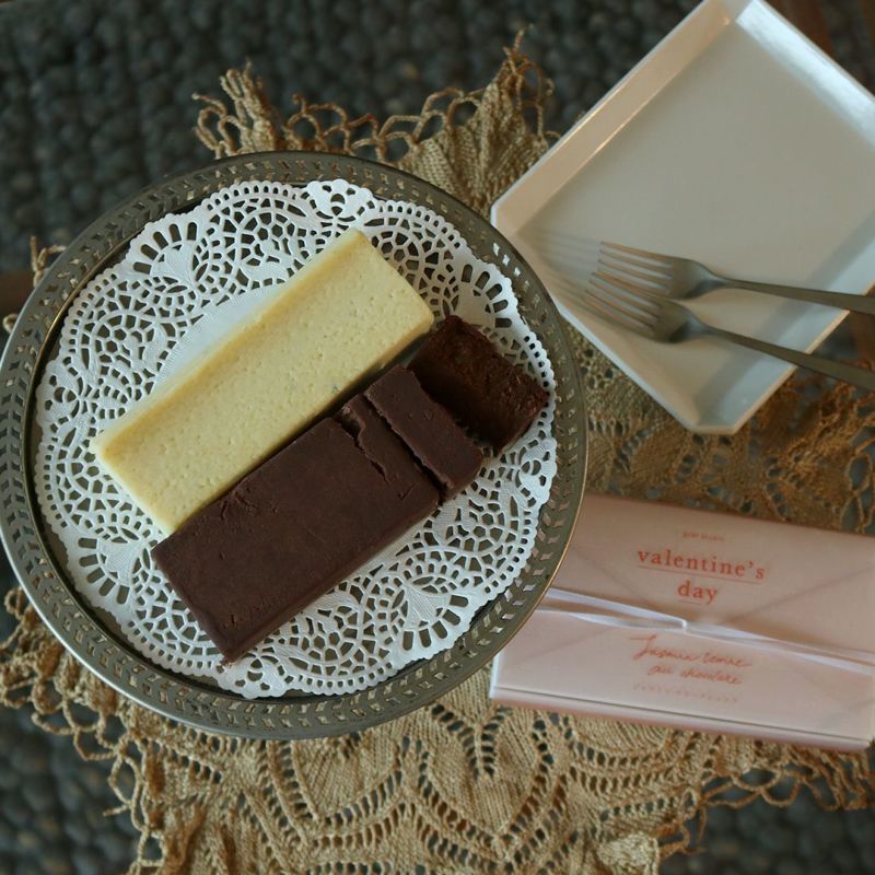ホワイトチョコレートをベースにゴルゴンゾーラ、クリームチーズ、サワークリームの3種類のチーズを使った贅沢なホワイトチョコのテリーヌです。卵を使わず、たっぷりの生クリームを使っているのでしっとりどしっとした濃厚な味わいにチーズの塩味が癖になります。スイーツとしてもお酒のお供としてもお楽しみいただけます。ワインが好きな方にもおすすめです。少しおとななバレンタインをお楽しみください。