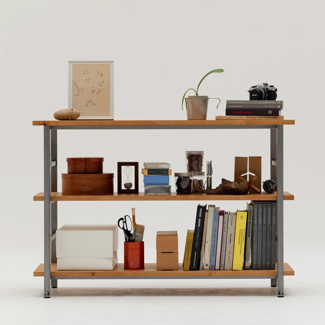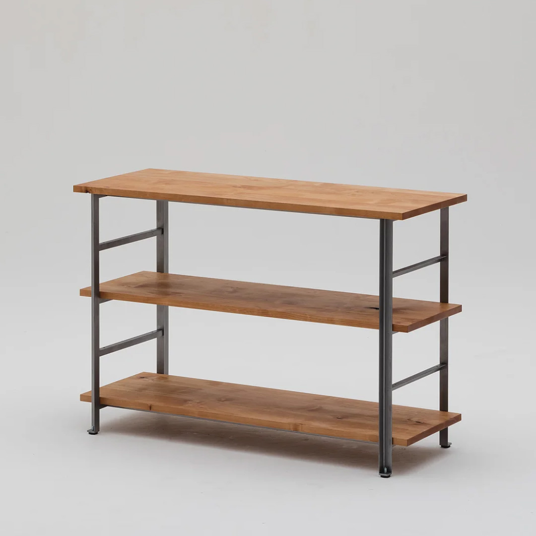 L字アングルのスチールフレームと、アルダー無垢板を組み合わせた、素材感のあるオープン収納棚です。
