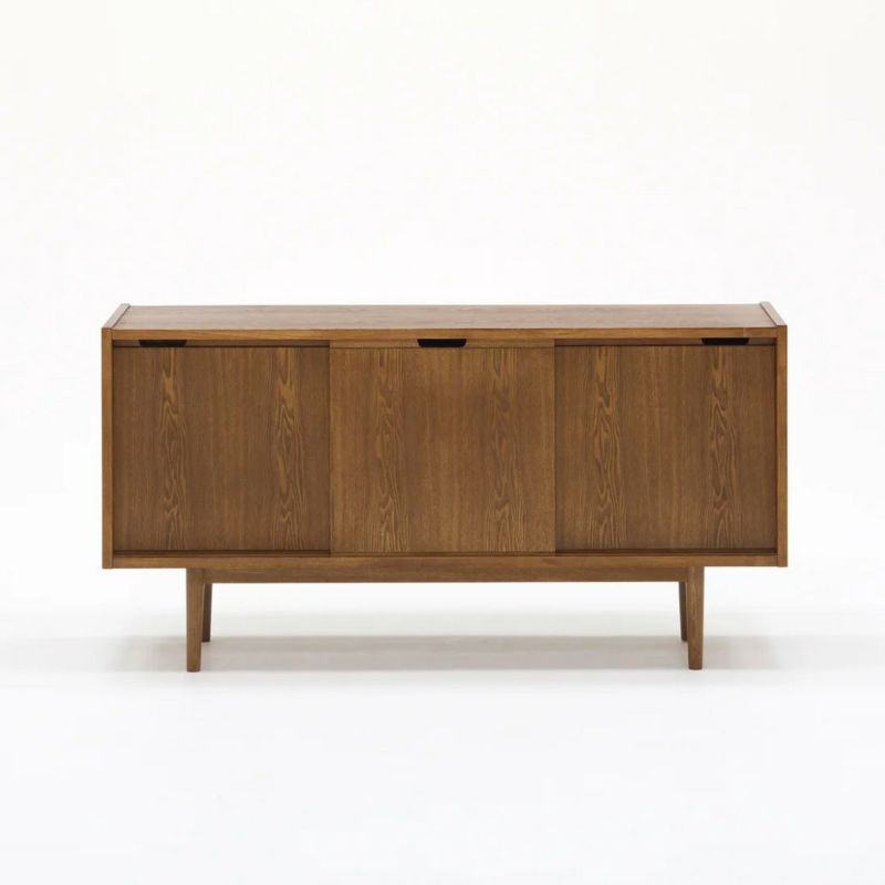 3枚の引き戸と、素材の表情が落ち着いた雰囲気のサイドボードです。それぞれの引き戸の中には、可動式の棚板が2枚ずつセットされており、整理しながらの収納に便利です。