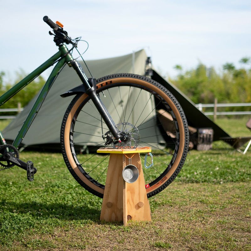 実はこちらのスツールは、バイクスタンドとしてもご使用いただけるようになっています。ふたつに分かれ、そこに自転車の前輪を固定。ご自宅の中に自転車を置いておきたい方、キャンプなどアウトドアで自転車を停めておきたい方、自転車好きの方にぜひ使っていただきたいスツールです。