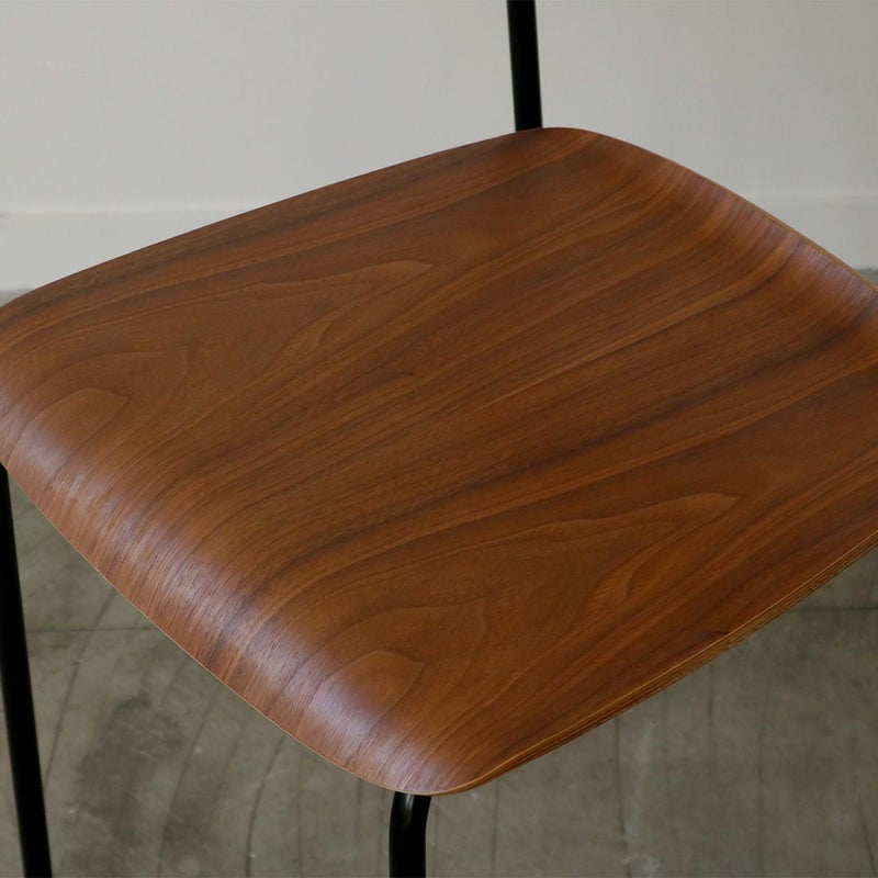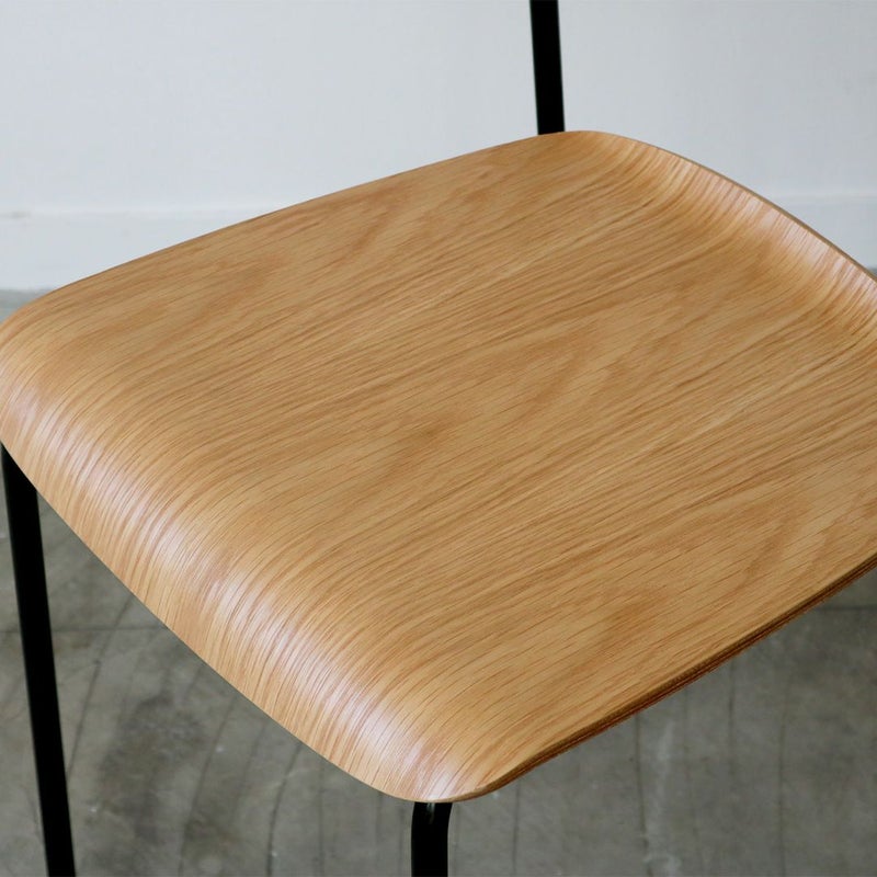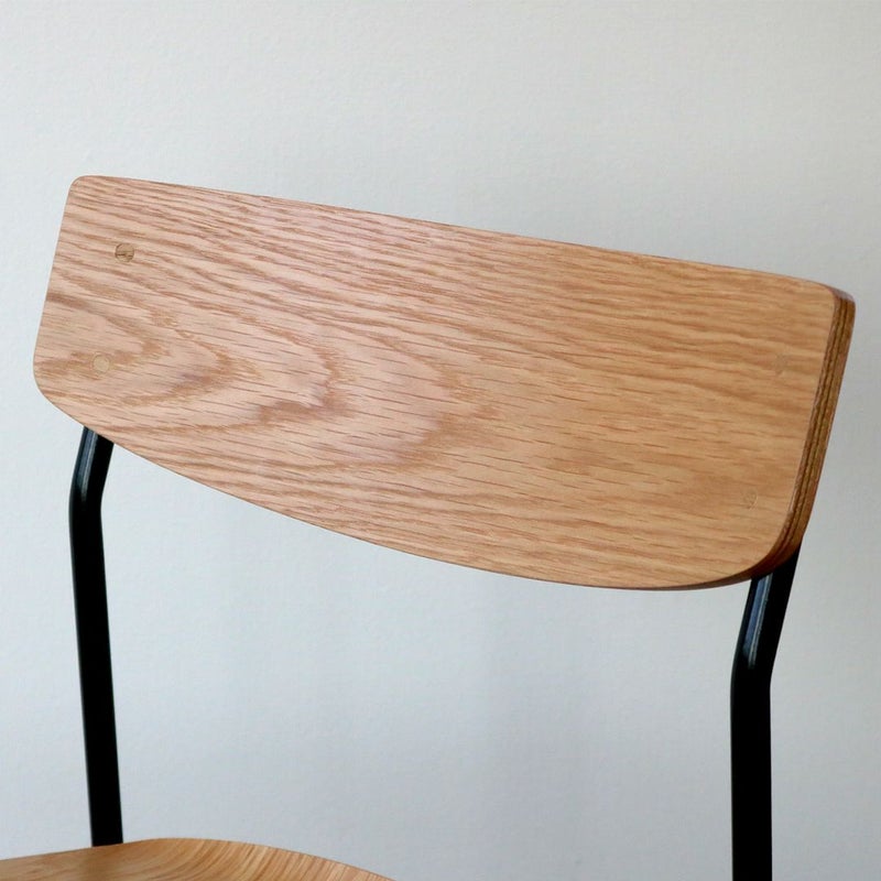背もたれは、適度な幅と安定感のある曲げ木で包み込むように安定させています。スチールの後ろ脚を前にゆるやかに傾斜させることで、横から見た際にすっきりとした印象になっています。
