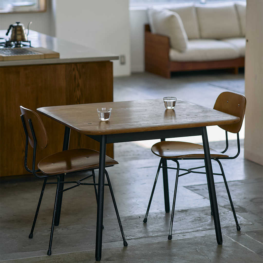 1~2人暮らしに最適な、grafオリジナルの正方形のダイニングテーブル。無垢材の質感が気持ちいい滑らかな面取り仕上げの天板と、シンプルですっきりとしたスチールフレームとのコンビネーションがおりなす、清潔な佇まいが特徴です。