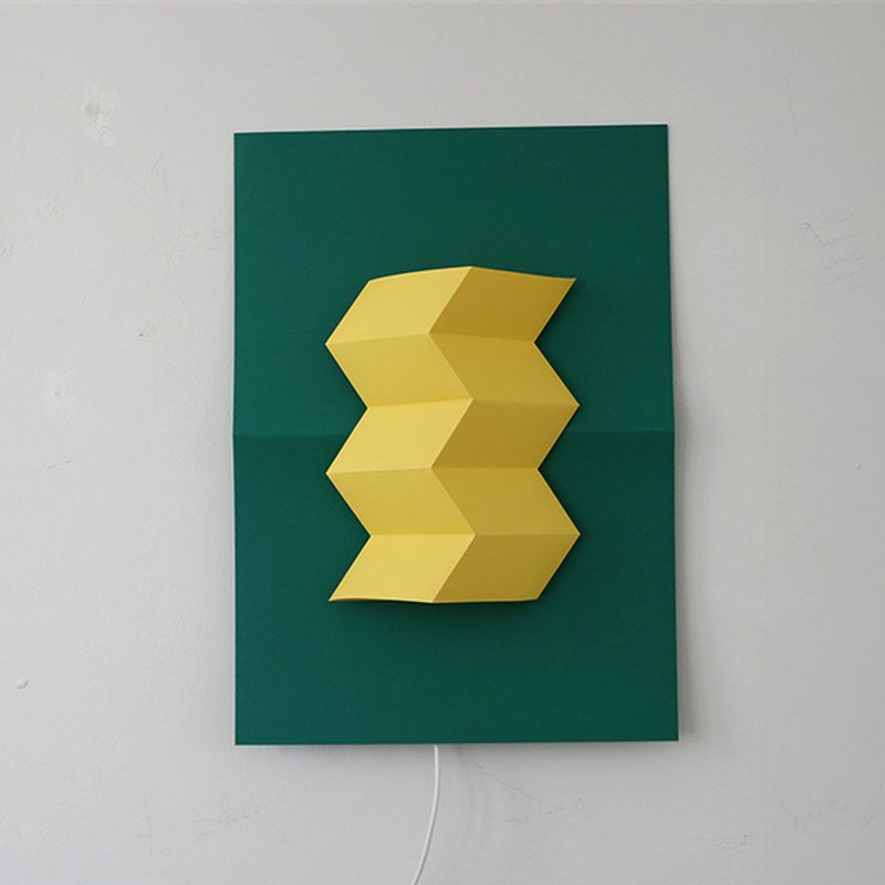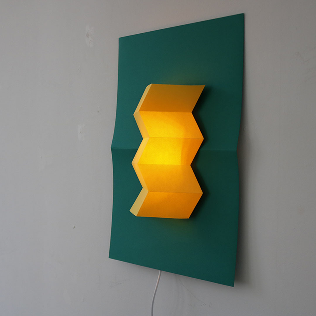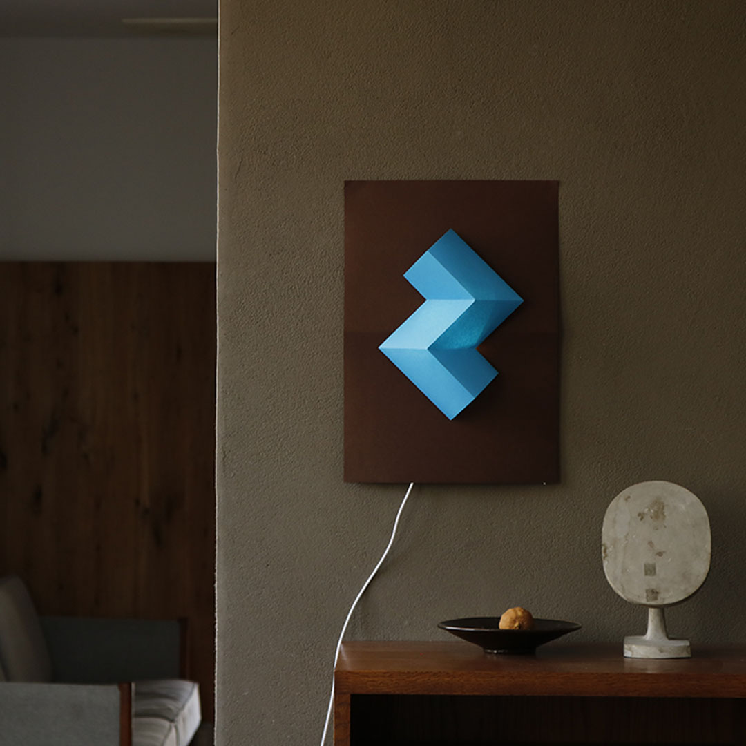 紙だからできる、山折りと谷折りでできた幾何学立体の表現。消灯時・点灯時問わず陰影が美しいライトです。