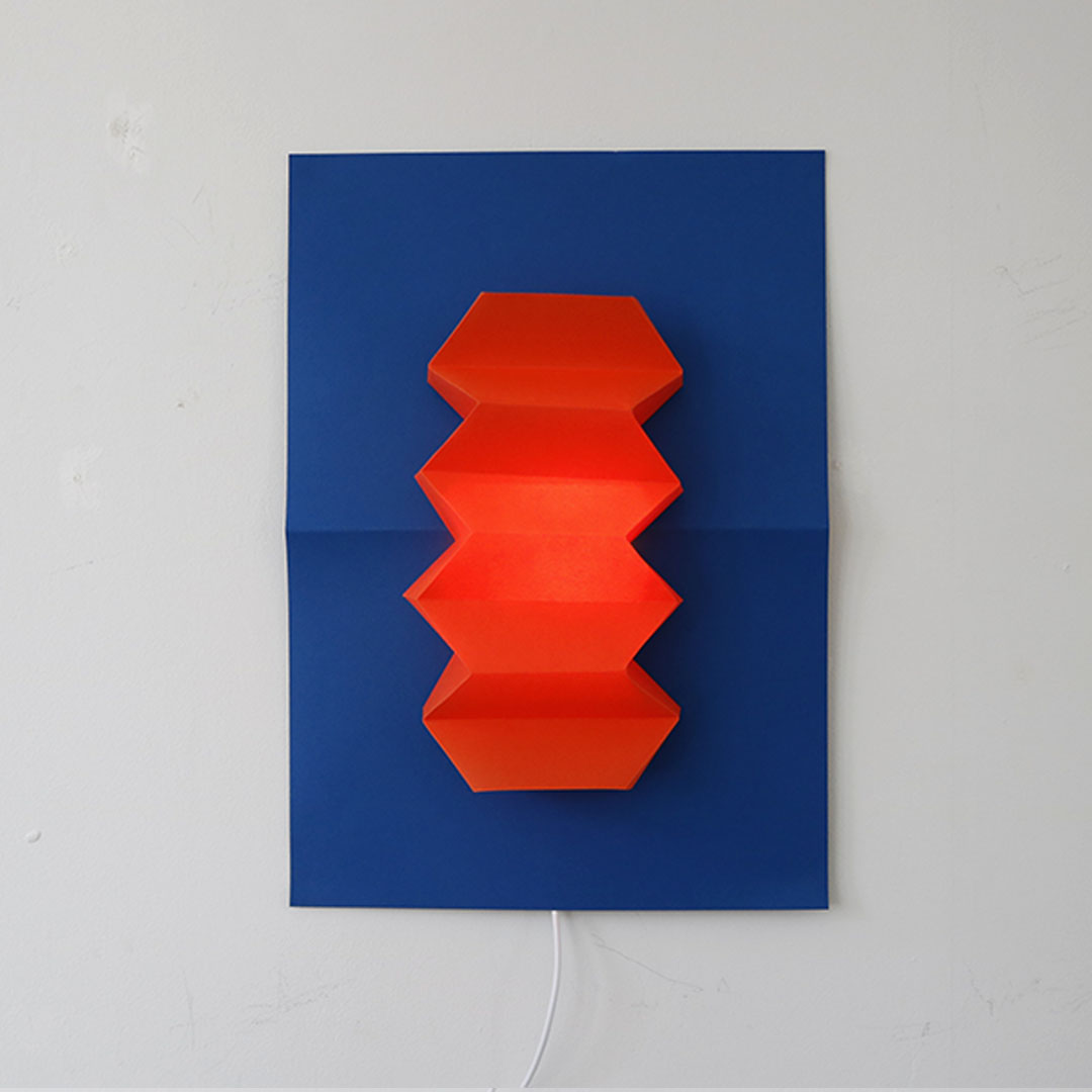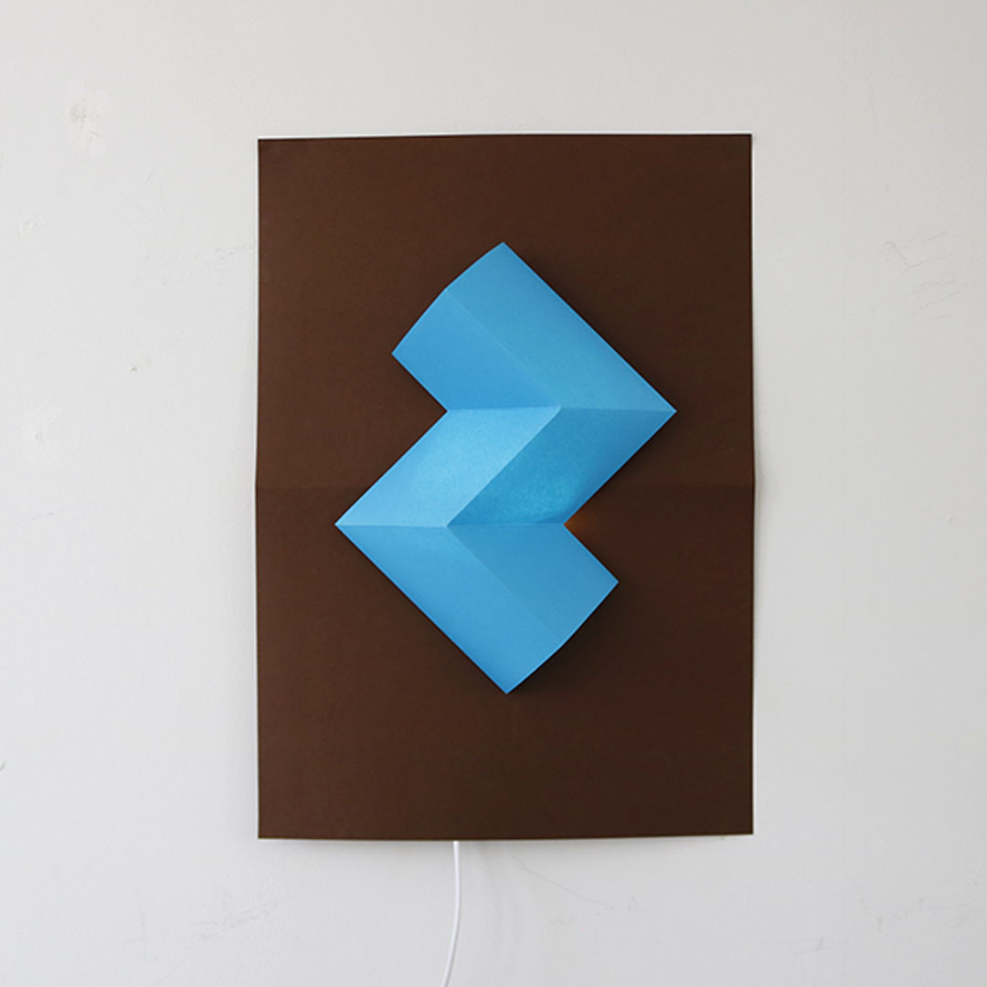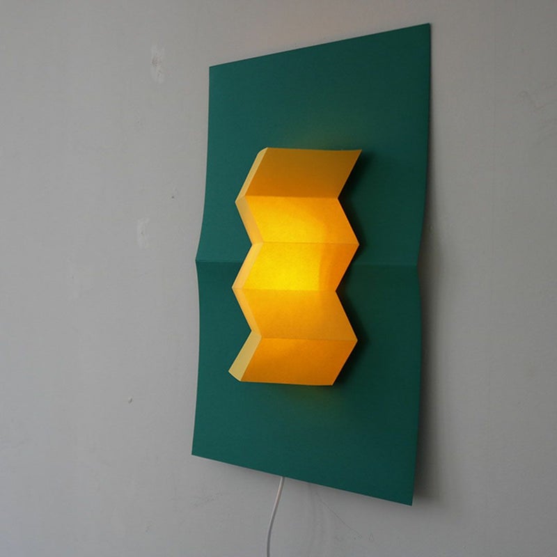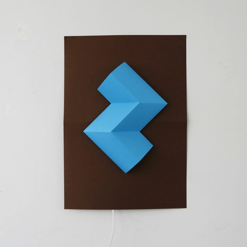 紙だからできる、山折りと谷折りでできた幾何学立体の表現。消灯時・点灯時問わず陰影が美しいライトです。