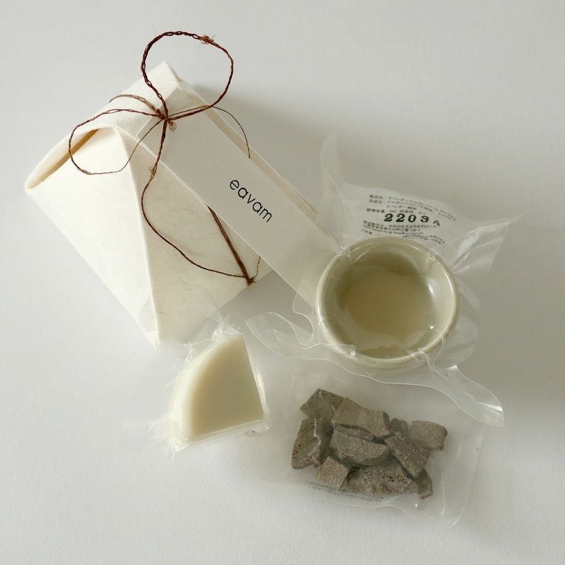 eavamの基本ラインナップを気軽に体験できるトライアルセットです。中に入っているのは、ガスール、エクストラバージンオリーブソープ、陶器入りのラベンダーアルガンバームです。シンプルで贅沢な成分が、お肌に正直な効果をもたらし、毎日を健やかに保ってくれます。