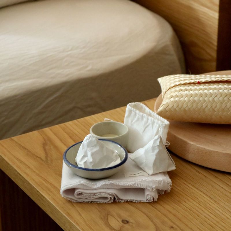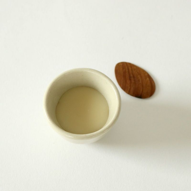 猪口型の器は、日本の紅皿に見立て、バームが入れられています。携帯用に蓋を兼ねた布カバーをつけていますが、普段はテーブルや小皿に伏せてお使いください。