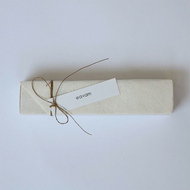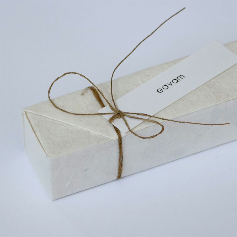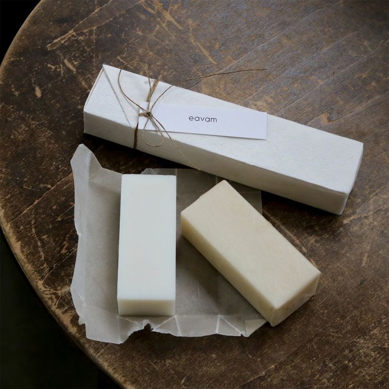 そして、しっかりとした洗浄力と豊かな泡立ちで、洗顔からボディ洗い、そして食器洗いからお洗濯まで、日常使いのコールドプロセス石鹸としてご好評いただく、ココナッツオイル石鹸。この2つを組み合わせた素晴らしい石鹸を、eavamのミツロウラップ「ビーワックス・サーペーパー」できっちり密封し、手漉き紙で美しく包んで設えました。