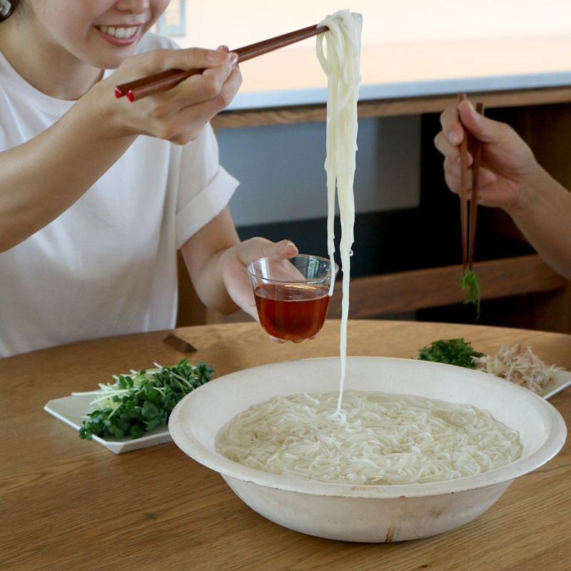 細口と太口からお選びいただけます。細口はサッと2分の茹で時間。オリーブオイルやチーズ、トマトなど、夏野菜との相性もぴったりなので、いつもの素麺とは一味違うレシピを試すのもオススメです。