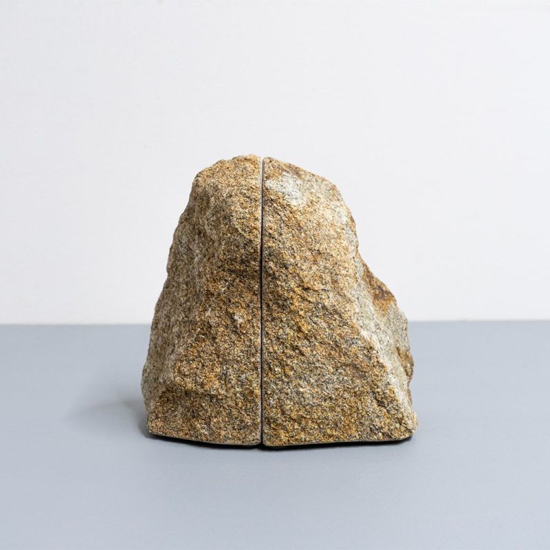 こちらはスパッとした断面が気持ちのいいブックエンド、「ROCK END」です。職人の手により、底面と断面を真っ直ぐに裁断、研磨されており、ぴったりと石同士が合わさるさまは不思議な美しさを感じることができます。地面と石の対比、本と石の対比。自然物が織りなす不自然な直線美は、唐突でありながらその重量感と安定感で、ユニークな空間を作り出します。