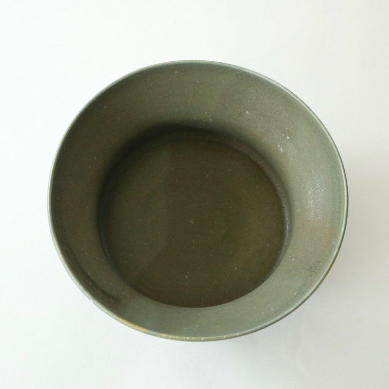 グリーンブルーの釉薬で艶のないマットな仕上がりになります。重なり合った釉薬がグラデーションになっていて、向きや光の加減で景色も違って見えます。おもてなしの際、大鉢としてお料理を入れていただく他、お花生けをいただいても映えるうつわです。