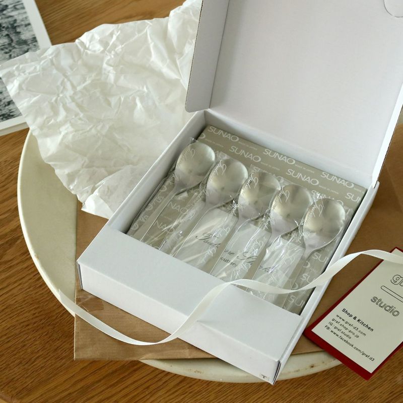 こちらは、SUNAO ティースプーン5本セット。お客さまが来られた際など、ティースプーンは揃えてお出ししたいもの。ご結婚のお祝いや、引越し祝いにも、きっと喜んでいただけます。