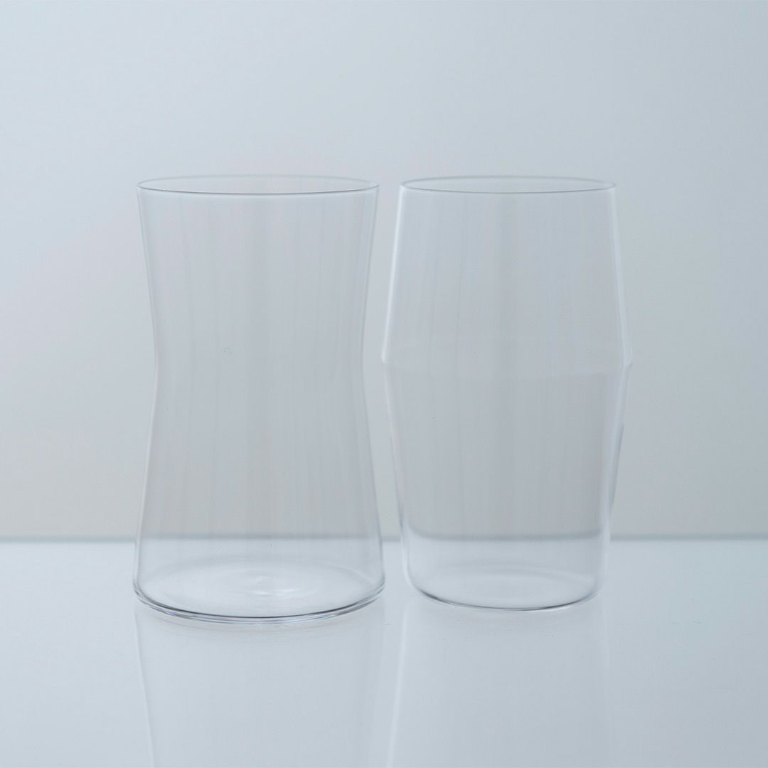 一見バラバラの形に見えるグラスを隣同士並べると輪郭が綺麗に重なりあいます。その姿はお互いに支えあっているかのような、持ちつ持たれつな見た目。