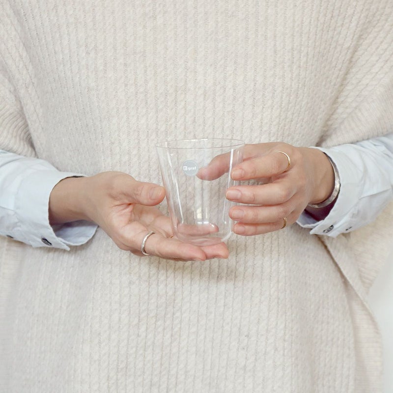 【おいしそうに見える・触れてみたくなる・いいさわり心地・味わうことを邪魔しない】という考えをベースに【飲み物が入って完成するグラス】をイメージしたgrafオリジナルのグラスです。容量は255mlと食事中にも使いやすいサイズ感です。