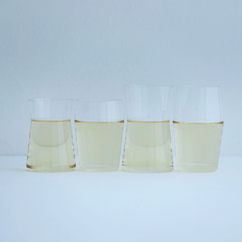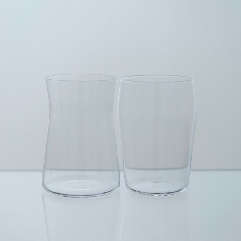 一見バラバラの形に見えるグラスを隣同士並べると輪郭が綺麗に重なりあいます。その姿はお互いに支えあっているかのような、持ちつ持たれつな見た目。
